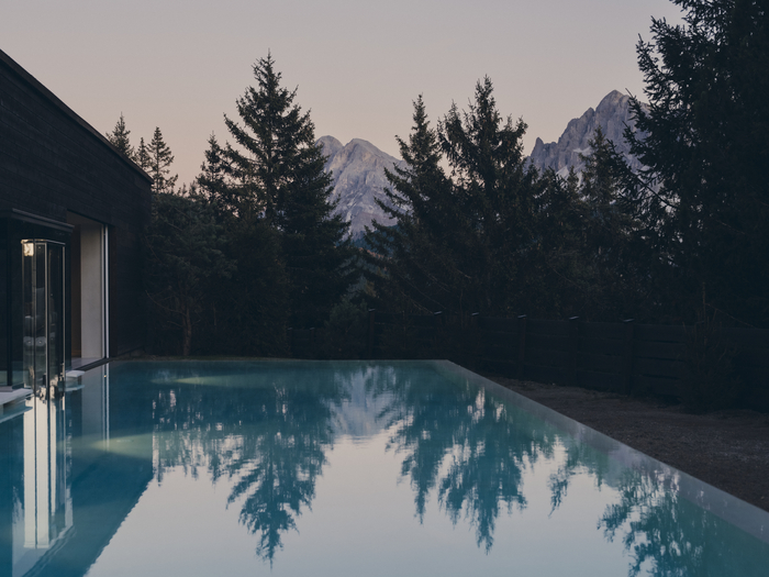 수영장 / 사진=포레스티스 빌라 해발 1800m 돌로미티 산맥 한가운데 포레스티스 빌라(Forestis Villa)가 자리한다. 물,공기,태양,기후 등 네 가지 자연 요소를 중심으로 설계한 웰니스 리조트로 유네스코 세계유산으로 지정된 돌로미티의 풍광을 품었다.