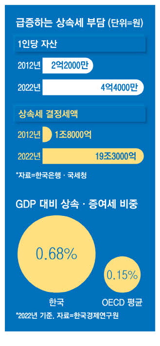 국세청에 따르면 상속세 결정세액이 2012년 1조8000억원에서 2022년 19조3000억원으로 치솟았다. 과도한 상속세 부담 탓에 외국으로 떠난 기업,해외 사모펀드에 팔려 나간 기업,문을 닫은 기업의 가치 유실과 고질적인 코리아 디스카운트가 한국 경제의 발목을 잡고 있다는 게 경제계 시각이다.