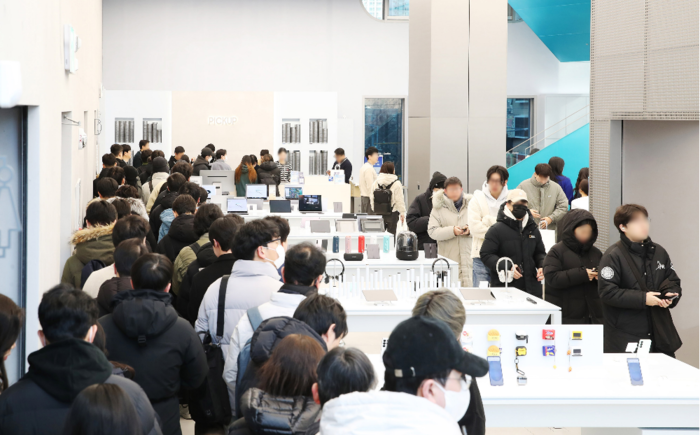삼성전자의 스마트폰 갤럭시S25 시리즈 사전 개통이 시작된 지난 2월 4일 서울 서초구 서초동 삼성 강남을 방문한 고객들이 픽업존 앞에서 제품 수령을 하고 있다. [사진 = 삼성전자] KT가 갤럭시S25 시리즈 사전 예약 당시 예약 신청 취소를 당한 고객에게 추가 보상을 진행한다.