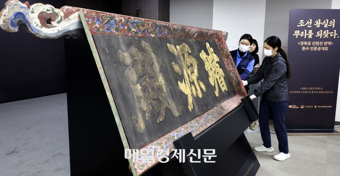 27일 서울 종로구 국립고궁박물관에서 국가유산청이 ‘경복궁 선원전 편액’(널빤지 등에 그림을 그리거나 글씨를 써서 방 안이나 문 위에 거는 액자)을 공개하고 있다. 국가유산청과 국외소재문화유산재단은 라이엇게임즈의 후원을 받아 일본으로 반출됐던 ‘경복궁 선원전 편액’을 지난 해 환수했다. 2025.2.27 [김호영기자]