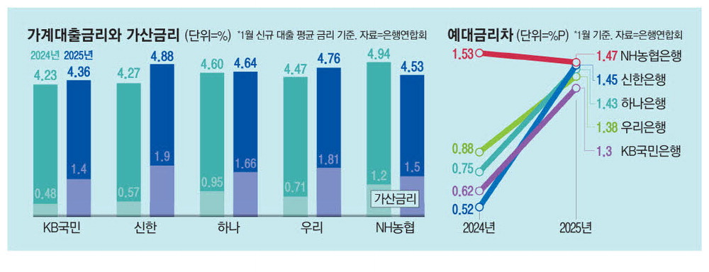 그러나 대출 신청부터 실행까지 최소 1~2개월의 시차가 있는 주택담보대출이 주를 이루는 가계대출의 특성상 대출 잔액은 쉽게 떨어지지 않았고,금리만 올라가는 상황이 됐다. 가산금리 인상이 본격화되기 시작했던 작년 8월 KB국민·신한·하나·우리·NH농협은행 등 5대 은행의 가계 예대금리차는 0~1%포인트대 초반 수준에 그쳤다. 실제로 신한은행과 우리은행의 예대금리차는 지난해 8월 0.24%포인트에 그쳤다. 그러나 이후 계속 대출 금리가 오르고 예·적금 금리는 그대로 유지되면서 금리차는 1%포인트대 중반까지 상승했다.