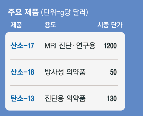 가격은 그야말로 금값이다. 의료영상용으로 쓰이는 산소-17 농축수는 g당 1200달러 수준이다. 방사성의약품에 쓰이는 산소-18은 g당 50달러,탄소-13은 130달러 정도다. 공급보다 수요가 부족해지면서 2023년 중수소 시장 가격이 전년도 대비 약 2배 증가했다. 세포 배양 배지에 쓰이는 탄소-13 등 다른 동위원소 가격까지 들썩이고 있다.