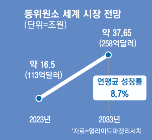 정 대표는 “2010년대 들어 삼성전자와 SK하이닉스 등의 반도체 업체에서 중수소를 쓰기 시작했다”며 “그 밖에도 진단 의약품이나 양자 센서 등의 분야에서도 안정 동위원소 수요가 급증하고 있다”고 말했다. 시장조사업체 ‘얼라이드마켓리서치’에 따르면 세계 동위원소 시장은 2023년 113억달러(약16조5000억원)로 2033년까지 연평균 8.7% 성장해 258억달러(약37조6551억원)에 이를 전망이다.