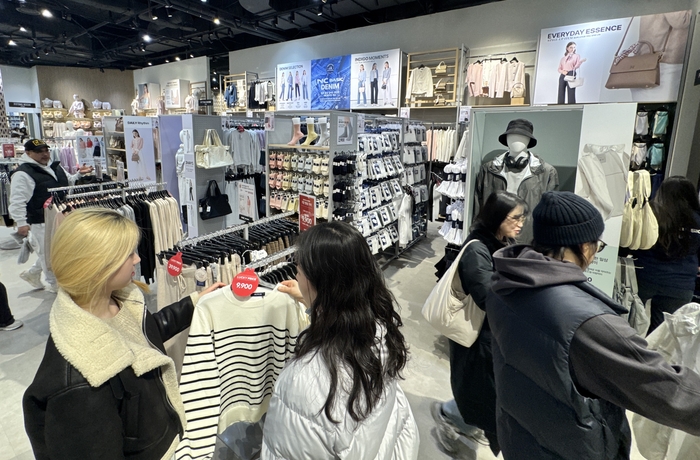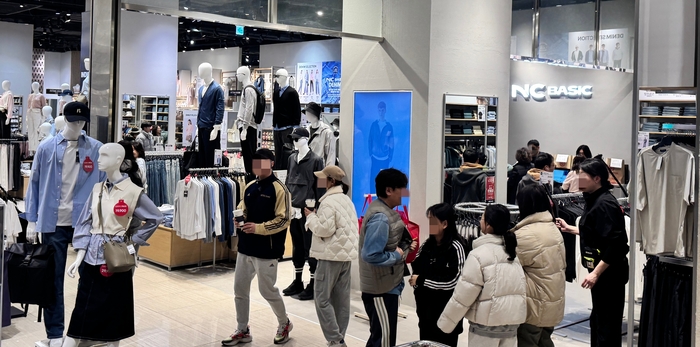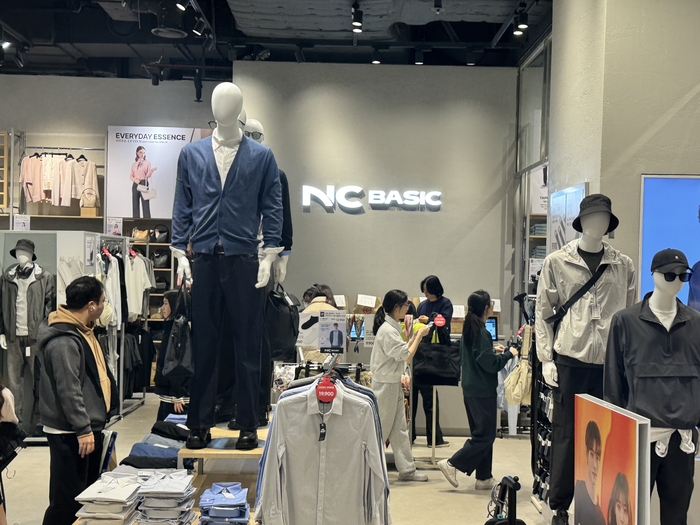 지난 1일 개점한 서울 송파구 NC송파점 NC베이직 대형 모델 매장에서 고객들이 상품을 살펴보고 있는 모습. 이랜드리테일 기세를 확장해 올해는 대규모 점포도 열었다. NC베이직은 지난 1일 서울 송파구 NC송파점 1층에 첫 대형 모델 매장을 리뉴얼 오픈했다. 그동안 소형 매장을 통해 NC베이직의 가능성을 시험해온 이랜드리테일이 공격적인 확장을 시작했다.
