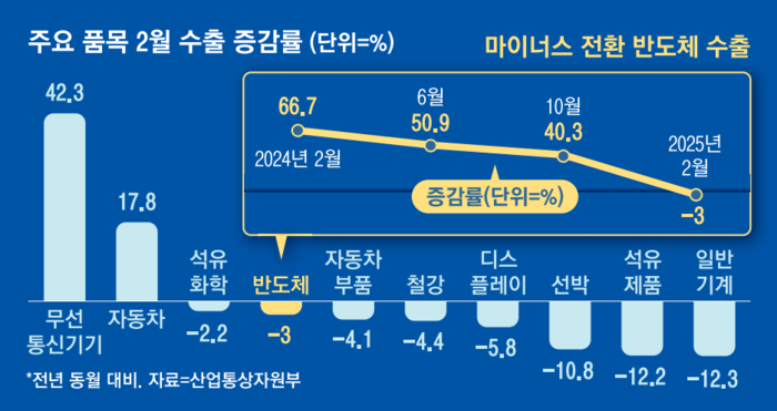 2일 산업통상자원부에 따르면 지난달 15대 수출 품목 중 전년 동월 대비 수출이 늘어난 품목은 4개에 불과했다. 자동차(17.8%),바이오의약품(16.1%),무선통신기기(42.3%),컴퓨터(28.5%)를 제외한 품목은 모두 수출이 감소했다. 최대 수출 품목인 반도체를 비롯해 이차전지(-9.6%),석유제품(-12.2%),철강(-4.4%) 등은 모두 감소했다. 일반기계(-12.3%),선박(-10.8%) 등 품목도 지난달 수출이 줄어들었다.