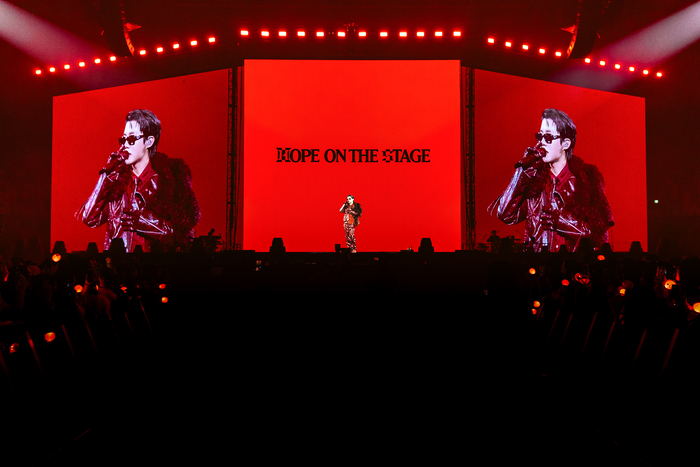 지난달 28일~2일 3일간 송파구 KSPO돔에서 연 솔로 월드투어 콘서트 ‘홉 온 더 스테이지’에서 강렬한 붉은 착장으로 노래하는 BTS 제이홉. 사진제공=빅히트 뮤직