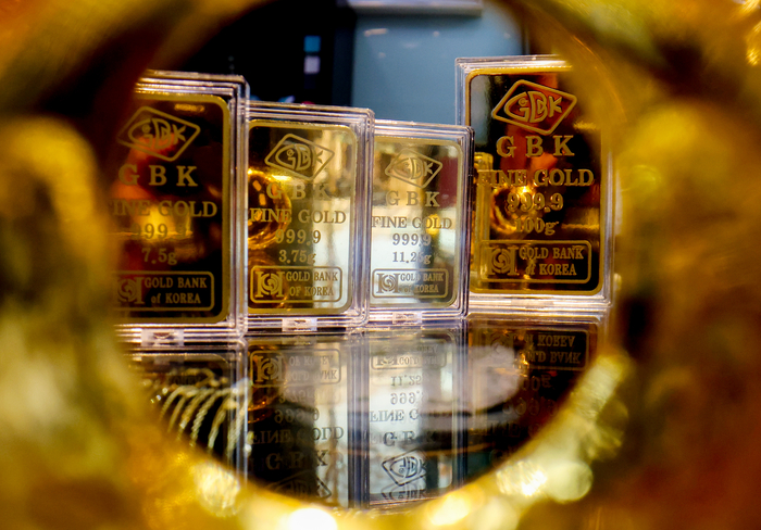 지난달 21일 서울 종로구 범창쥬얼리에서 촬영한 골드바 모습.[사진제공=연합뉴스] 금 가격이 치솟으면서 명품 브랜드에 이어 국내 토종 주얼리 브랜드들도 가격 인상 행렬에 합류하는 모습이다.