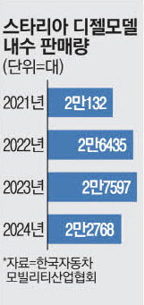 판매량은 준수했다. 가솔린 차량이 없는 만큼 디젤 차량이 볼륨 모델 역할을 했다. 스타리아 디젤의 판매량은 지난해 2만2768대를 기록했다. 이는 디젤 버전이 남아있는 현대차 차종 중에서는 가장 많은 판매량이다. LPG 모델(9996대),하이브리드 모델(8354대)의 3배에 달한다.
