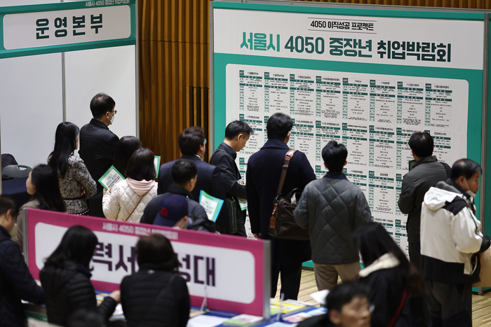 6일 서울시청에서 2025 서울시 4050 중장년 취업박람회가 열리고 있다.[사진제공=연합뉴스] 국내 주요 대기업에 다니는 여성 직원의 연봉은 남성의 70% 수준이고,전체 직원 중 여성은 4명 중 1명꼴인 것으로 나타났다.
