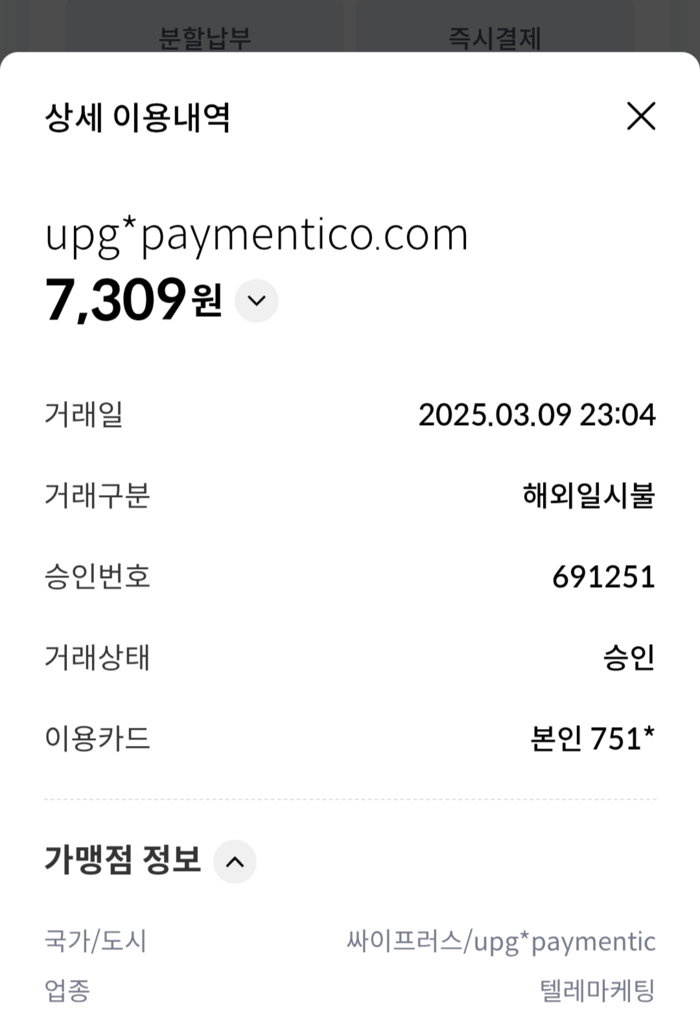 A씨가 9일 밤 받은 해외 결제 승인 내역. 서울에 거주하는 A씨는 지난 9일 밤 손흥민 선수가 출전한 축구 경기를 보다가 밤 11시경 해외 신용카드 승인 알림 문자를 받았다. 전혀 알지 못한 ‘UPG PAYMENTICO’라는 업체로부터 4.99달러를 결제당한 것이다. 이상함을 감지한 A씨는 즉시 카드사에 문의해 결제 정지와 분실 신고를 진행했으며,다행히 해당 거래는 이후 취소 처리됐다.