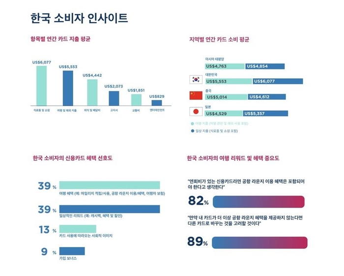 특히 한국인들은 ‘공항 라운지 이용 혜택’을 선호하고 편이다. 연회비가 있는 신용카드를 사용할 때 가장 기대할 수 있는 여행 혜택으로 한국 응답자의 10명 중 8명(82%)은 ‘공항 라운지 이용 혜택’을 꼽았다. 이들 가운데 89%는 현재 사용 중인 카드에서 공항 라운지 혜택이 제공되지 않을 경우 새로운 카드로 변경할 의향이 있다고 응답했다. 공항 라운지 혜택이 소비자의 카드 선택 및 유지에 핵심 역할을 한다는 의미다.