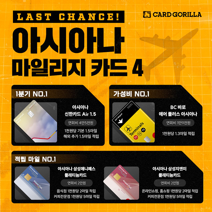 카드고릴라가 단종 전 챙겨야 할 ‘아시아나 마일리지 카드’ 4종을 11일 공개했다.
