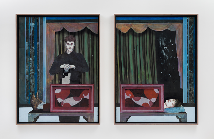 헤르난 바스 ‘필요와 불필요 사이의 공간’(2024). 리만머핀 이번 전시회의 제목과 같은 ‘필요와 불필요 사이의 공간’ 작품은 마술을 모티브로 했다. 마술사가 사람을 반으로 가르는 쇼를 선보이는 순간을 그렸는데 실제로 두 캔버스에 반반씩 담았다. 바스는 “마술은 생존에 있어 불필요하지만 기쁨을 위해 필요하다. 마술로 사람을 반 갈라서 필요와 불필요 사이의 공간을 표현했다”고 설명했다.