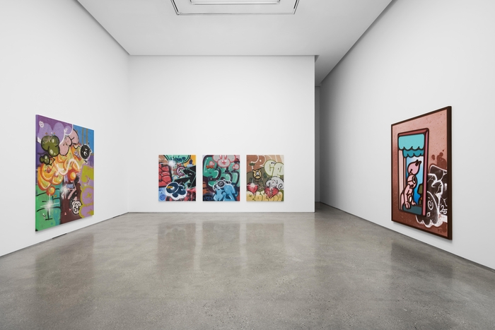 컴퓨터 그래픽을 활용한 기존의 팝아트 외에 그래피티 형태로 스프레이와 물감을 사용해 즉흥적으로 그린 새로운 시리즈 ‘Wall’을 선보인 샘바이펜 개인전 ‘LAZY’ 전경. PKM갤러리