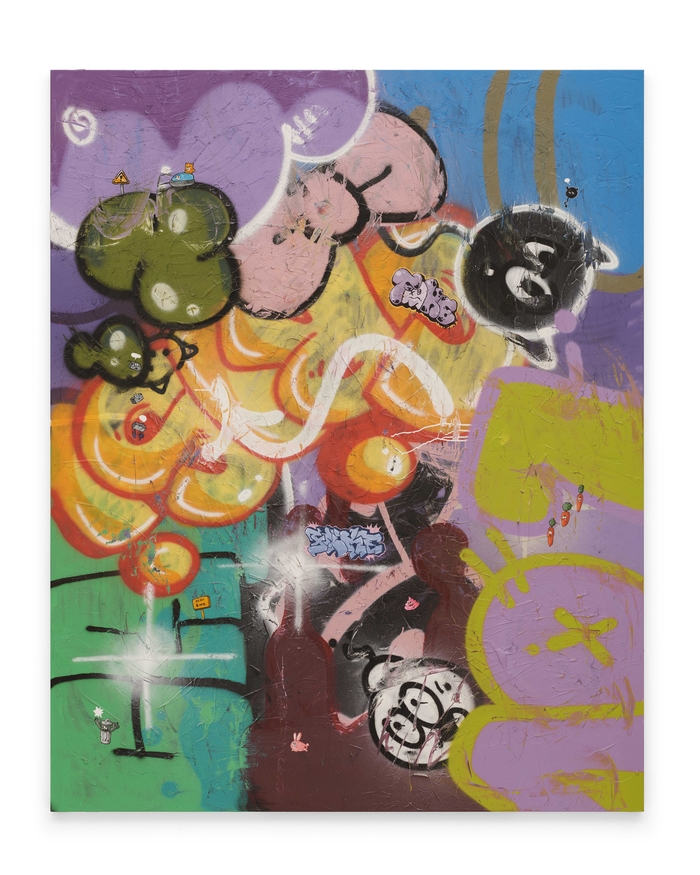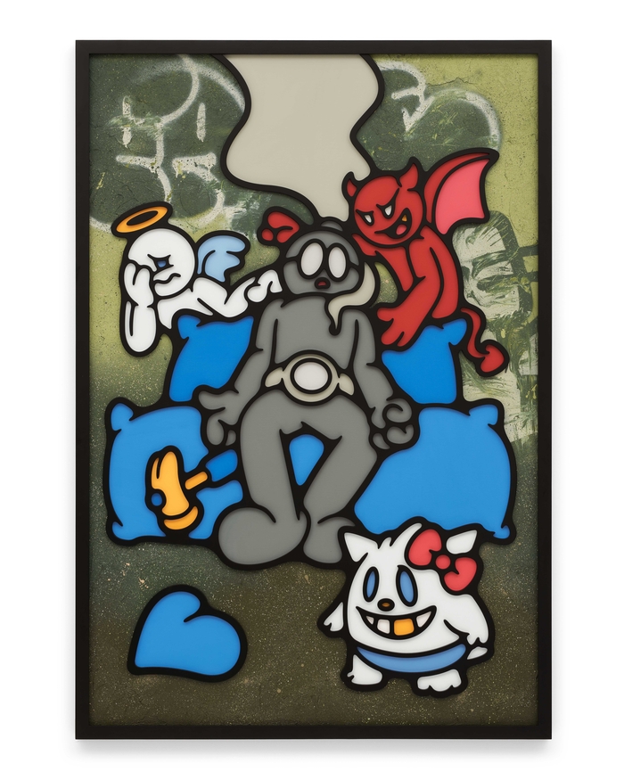 이번 전시에선 그라피티 시리즈 ‘Wall’도 처음 선보인다. 기존 작업 방식은 컴퓨터 그래픽과 나무 CNC 가공(컴퓨터를 활용한 재료 절삭 공정),펜 드로잉과 물감칠 위주였다. 선명한 색감에 나무 테두리를 입힌 입체감이 특징적이다. 반면 그라피티는 스프레이와 물감으로 도색을 반복하고 그 위에 세필로 그림을 덧그려 길거리 외벽 느낌을 구현했다. 마치 스프레이 벽화 위에 풍선껌 판박이 스티커가 여기저기 붙어있는 듯하다. “기존 작업은 디지털 작업 후 현실화했다면,이번 시리즈는 처음부터 끝까지 즉흥적으로 이뤄졌어요. 익숙한 것에만 갇히지 않기 위해 고등학교 때 써봤던 스프레이를 다시 쥐었습니다.”