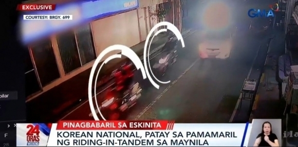 지난달 필리핀 마닐라 말라테구 길거리에서 한국인 A씨에 총격을 가한 강도 4명이 오토바이 2대(흰색 원 안)에 나눠 타고 달아나는 모습. 기사와 직접적인 관련 없음. [사진 = GMA뉴스 유튜브 캡처] 주필리핀 대한민국 대사관은 ‘총기 강도사건 급증 안전 공지’와 함께 특히 5월 여행 주의보를 내렸다.