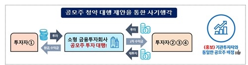 금감원은 금융사 계좌로 투자금을 송금하면 기관 명의로 공모주에 투자한 후 수익을 제공하겠다는 공모주 투자대행은 ‘무인가 투자중개업’으로 불법행위라고 설명했다.