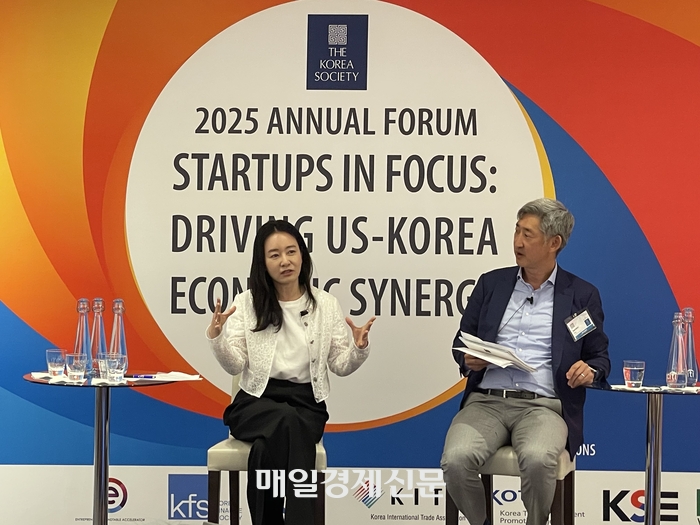 윤송이 프린시플벤처파트너스(PVP) 창립자 겸 매니징 파트너(왼쪽)와 샌더 허 찰스뱅크캐피탈파트너스 대표가 22일(현지시간) 미국 뉴욕 시티그룹 본사에서 코리아소사이어티 주최로 열린 스타트업 연례포럼에 기조 연사로 참석해 발언하고 있다. <사진=윤원섭 특파원> “트럼프 시대 투자 환경도 변했습니다. 과거 단순히 경제 최적화만 했다면 이젠 안보와 지정학까지 고려해야 합니다.”