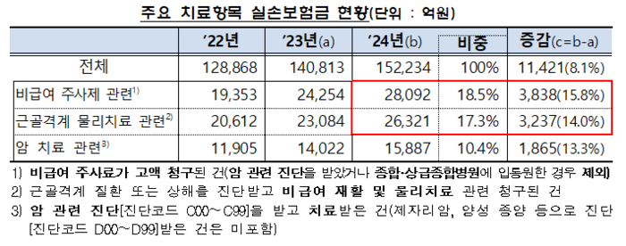 비급여주사 보험금은 2023년 25.3%,2024년 15.8% 늘었고,근골격계질환 보험금은 2023년 12.0%,2024년 14.0% 증가하는 등 쏠림현상이 심화하고 있다.