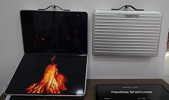플렉시블 브리프 케이스. [사진출처 = 삼성디스플레이] 플렉시블 브리프 케이스는 18.1형 폴더블 OLED를 반으로 접어 손잡이가 있는 가방 형태로 사용할 수 있게 개발한 제품이다. 평소에는 태블릿 두 개를 합친 18.1형 크기로 크게 화면을 사용하다 이동 시 서류가방처럼 간편하게 휴대할 수 있다.