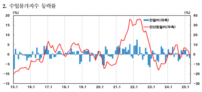 수입물가지수 등락률 [자료=한국은헹] 세부 품목별로 원유가 -7.4%,벙커C유가 -6.7%를 기록하면서 석탄·석유제품이 수입 물가 하락을 주도한 것으로 나타났다. 알루미늄정련품(-6.4%),이차전지(-8.2%) 등도 하락폭이 컸다.