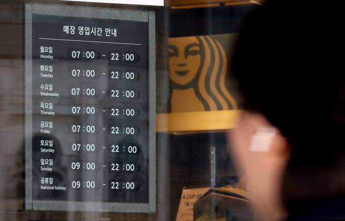 지난 12일 서울 시내 한 스타벅스 매장에 영업시간 안내문이 놓여 있다. [사진 = 연합뉴스] 스타벅스는 다음 달 중 제주도 일부 매장에서도 키오스크를 도입할 계획이다. 제주도 역시 관광객들이 몰리는 지역 중 하나다.