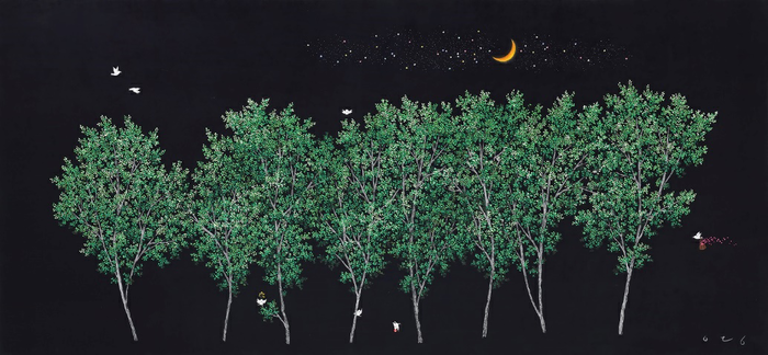 이영지 ‘포근한 어둠이 찬란해’(2025). 선화랑 작품들은 전체적으로 초승달이 뜬 밤을 배경으로 하고 있지만 일반적인 밤의 이미지처럼 어둡지는 않다. 화면은 밝은 하늘색 빛깔을 띨 때도 있고 벌건 대낮처럼 들판의 꽃들이 선명하게 모습을 드러내기도 한다. 이 작가는 “밤하늘에서 영감을 얻은 이미지지만 꼭 하늘이라고 생각하고 그리진 않았다”고 말했다. 실제로 ‘행복한 그 나날들’(2025)에서는 초승달이 화면 아래에 있고 그 위로 나무가 자라났다. 대지와 하늘의 경계도 알 수 없고 하늘과 땅이 전복된 것처럼 보이기도 한다.