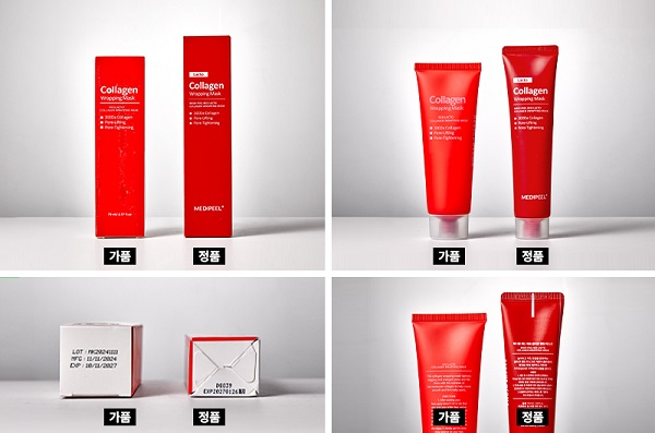 예를 들어 메디큐브의 ‘콜라겐 나이트 랩핑 마스크’ 위조제품의 경우,‘콜라겐’ 대신 ‘골라겐’이라는 오타가 적혔고 일부 제품에선 용량 표시가 ‘ml’이 아닌 ‘mi’로 표기됐다.