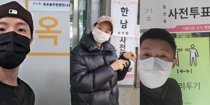 이 외에도 배우 정우성과 개그우먼 김신영,임신으로 부른 배를 검은 패딩으로 가린 배우 이하늬도 사전투표를 인증하는 게시물을 SNS에 업로드했다.