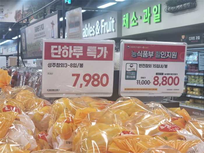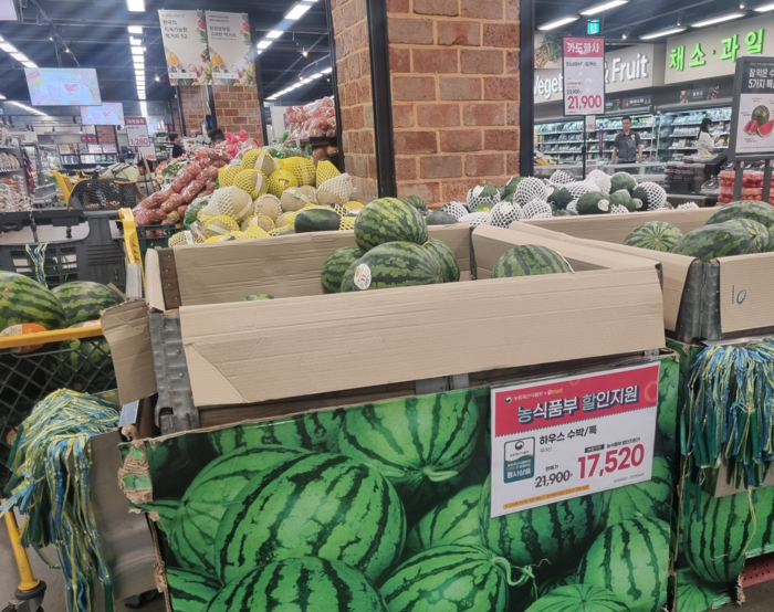 현재 이마트에서는 참외(15입내) 1만1000원짜리의 경우 행사가로 8800원에 판매 중이다. 2만1900원에 팔던 수박의 경우 이날부터 1만7420원에 살 수 있다. 신세계 포인트 카드 적립시 농식품부 할인 지원가가 자동 적용되는 식이다.
