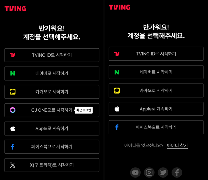CJ원과 엑스 아이디로도 로그인할 수 있는 티빙 로그인 화면(왼쪽)과 배달의민족 구독 상품 연동 시 로그인 화면. [사진 = 독자 제공] 티빙은 제휴 상품에 대한 내부 정보 제공 방침에 근거해 로그인 채널을 결정하고 있다고 설명했다.