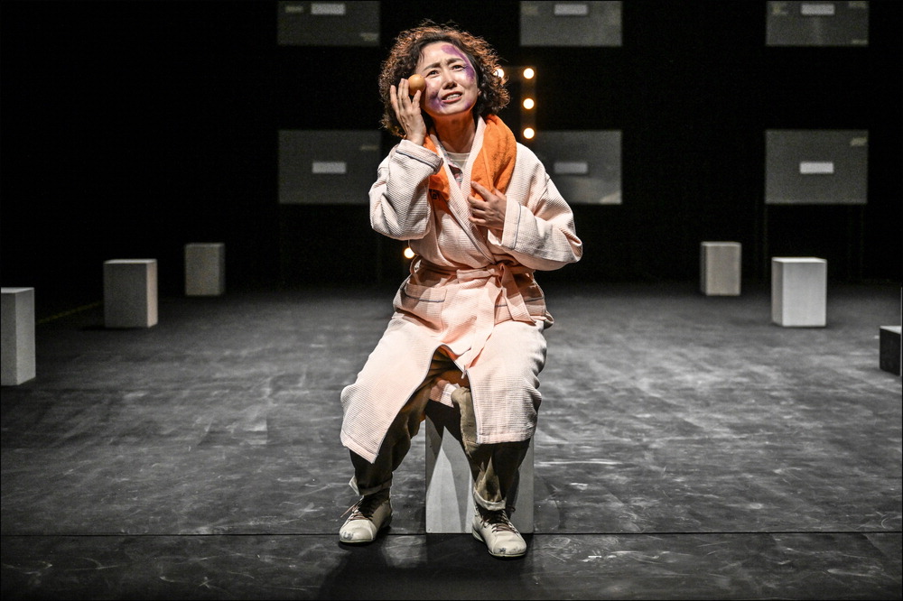 연극 '유령'에서 배명순 역(이지하)이 얼굴에 든 멍을 계란으로 문지르고 있다. 세종문화회관