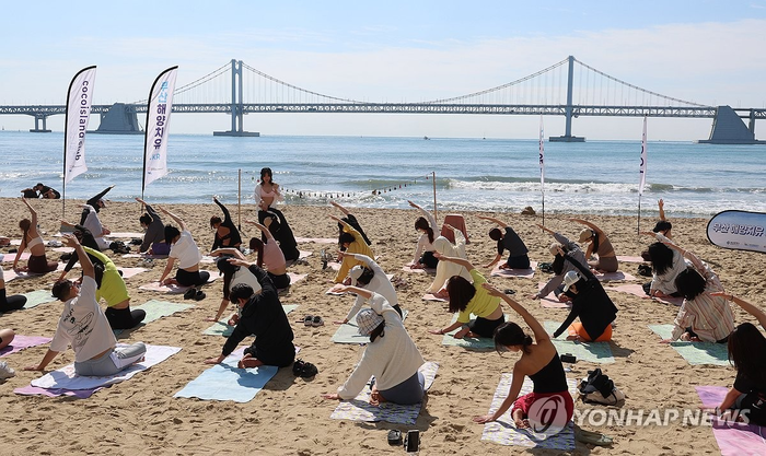 지난달 부산 수영구 광안리해수욕장에서 휴양객과 시민들이 해변에서 요가를 하고 있다. [연합뉴스]