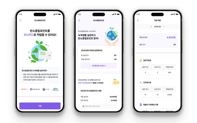 탄소중립포인트는 전자영수증 발급,텀블러·다회용기 사용,친환경 제품 구매와 폐휴대폰 반납 같은 일상에서 탄소중립 녹색생활을 실천하면 현금처럼 사용할 수 있는 포인트를 제공하는 서비스다. 월별 활동 실적에 따라 연간 최대 7만원까지 돌려받을 수 있다. 코나아이가 제공하는 탄소중립포인트 서비스는 탄소중립포인트 앱 '카본페이'를 코나카드 앱에 연동해 이용자가 친환경 활동 이용 시 이용 실적에 따른 탄소중립포인트를 코나캐시로 전환해준다.