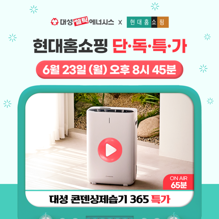 대성쎌틱에너시스는 현대홈쇼핑에서 ‘콘덴싱제습기 365’ 신제품 단독 방송을 오는 23일 진행한다고 20일 밝혔다.
