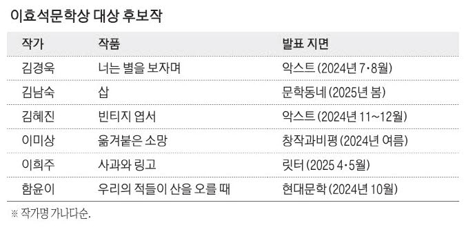 이효석문학상의 올해 최종심 진출작으로 김경욱의 '너는 별을 보자며',김남숙의 '삽',김혜진의 '빈티지 엽서',이미상의 '옮겨붙은 소망',이희주의 '사과와 링고',함윤이의 '우리의 적들이 산을 오를 때'가 선정됐다. 2025년 제26회 이효석문학상 심사위원회는 22일 이 같은 결과를 발표하고 "최종심에 오른 여섯 작품 가운데 단 한 작품을 대상 수상작으로 선정할 계획"이라고 밝혔다.