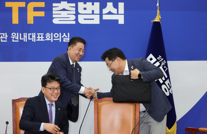 김병기 더불어민주당 당대표 직무대행 겸 원내대표가 24일 서울 여의도 국회에서 열린 물가대책TF 출범식에 참석하며 위원들과 인사하고 있다. [사진 출처 = 연합뉴스] 더불어민주당은 24일 민생 물가 대책을 논의할 당 태스크포스(TF)를 출범했다.