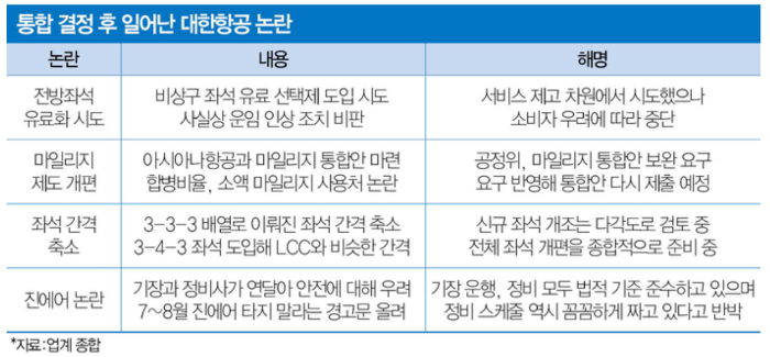 통합 대한항공 출범이 코앞으로 다가왔지만 시작부터 삐걱거리는 모습이다. 마일리지 통합안은 공정위로부터 퇴짜를 맞았고,중·장거리 노선 비행기는 ‘닭장 배열’ 논란으로 소비자 원성이 쏟아진다. 계열 LCC 진에어 관리 부실 논란도 덮쳤다. 대형 FSC 2개사가 합쳐지는데,자칫 LCC보다 못한 항공사가 될 것이란 불만이 속출한다.