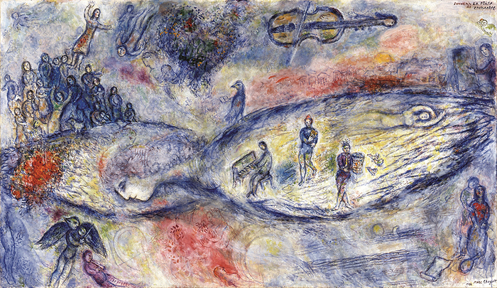 ↑ (Marc Chagall,Souvenir de la Flûte enchantée,1976,Tempera,oil and sawdust on canvas. © Chagall ®,by SIAE 2025.)
