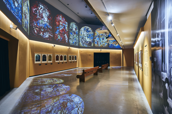 ‘마르크 샤갈 특별전’ 전시 전경(사진 예술의전당 제공) 이번 전시에선 샤갈의 건축 연계 프로젝트를 미디어아트로 구현한 몰입형 공간을 주목해보도록 하자. 샤갈이 그린 파리 오페라 극장의 천장화와 이스라엘 하다사 메디컬 센터의 12개 스테인드글라스가 대형 프로젝션과 사운드를 통해 실감나게 재해석됐다. 관람객이 이 공간에 입장해 고개를 들어 천장화를 바라보면,공간 전체를 감싸는 색채와 빛의 흐름이 마치 그 자체로 하나의 회화를 연상시킨다. 1930년대부터 시작된 성서 시리즈와 후기의 스테인드글라스 작업,그리고 샤갈의 색채 시학을 그야말로 온몸으로 경험해볼 수 있는 콘텐츠다.이 밖에도 오랫동안 샤갈의 작업실에 보관된 미공개 유화 7점이 예술의전당에서 최초로 공개된다. 이는 샤갈의 예술 인생이 무르익은 1949~1953년,1970년에 제작된 작품으로,샤갈의 독창적인 예술 세계와 탁월한 색채 감각이 그대로 담겨 있다. 색채에 생명을 불어넣어,시간과 감정을 동시에 끌어내는 샤갈의 작업을 섬세히 보여주는 작품이기도 하다.전시는 이처럼 샤갈의 이야기를 넘어 기억과 상상,감정을 공유함으로써,관람객 자신의 이야기를 투영하며 정서적 몰입 또한 경험할 수 있을 것으로 보인다.