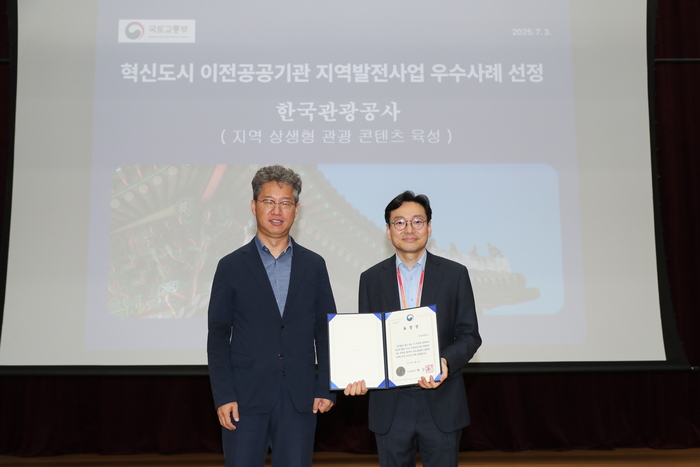 한국관광공사가 3일 공사 본사에서 열린 ‘2024 이전공공기관 지역발전사업 설명회’에서 지역발전 우수사례에 선정되어 국토교통부 장관상을 받았다 / 사진=한국관광공사 한국관광공사가 ‘2024 이전공공기관 지역발전사업 설명회’에서 지역발전 우수사례에 올라 국토교통부 장관상을 받았다.