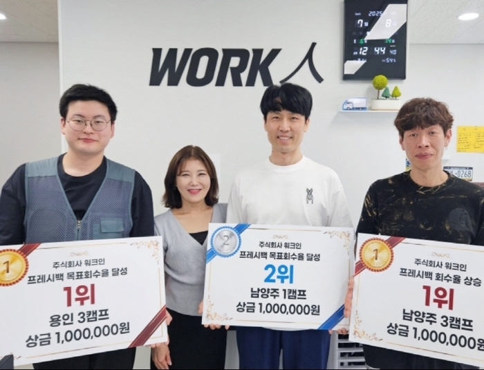 < 출처 : 워크인 > 용인3캠프 인대성 팀장은 “상금은 전액 동료들과의 회식 비용으로 사용할 예정”이라며 팀워크 강화를 약속했고,남양주1캠프 김명석 팀장은 “동료들에게 주유 상품권을 지급할 예정”이라 전했다. 남양주3캠프 박진영 팀장은 “사용처는 아직 미정이지만 동료들과 충분히 의논 후 결정하겠다”라고 소감을 말했다.