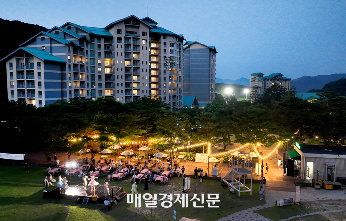 한여름 밤의 낭만페스타 23일 경기도 광주 곤지암리조트 잔디광장 내 셀프 BBQ가든을 찾은 투숙객들이 무대 위 배우들이 펼치는 공연을 관람하고 있다. 곤지암리조트는 여름 휴가철을 맞아 7월 11일부터 10월 초까지 ‘한여름 밤의 매직 타임 공연’을 선보인다. 숲 속 요정들의 이야기로 꾸며진 이번 공연은 바이올린·아코디언 연주,저글링,거리 공연 등 다양한 콘텐츠로 리조트 전역에서 펼쳐진다. 2025.07.24 [이승환기자]