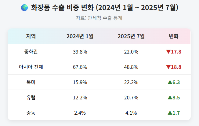 화장품 업계의 무게중심은 빠르게 이동하고 있다. 관세청 수출 통계에 따르면 지난해 1월부터 지난 7월까지 화장품 수출에서 중화권 비중은 39.8%에서 22.0%로 줄었다. 같은 기간 아시아 전체 비중도 67.6%에서 48.8%로 감소했다.
