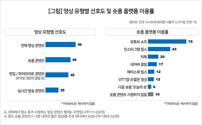 선호 주제는 유머·밈·웃긴 영상이 55%로 1위를 차지했다. 뉴스·시사·정보(35%),여행·브이로그(34%)가 뒤를 이었다. 성별로 남성은 게임·e스포츠를,여성은 먹방·요리,반려동물,뷰티·패션을 상대적으로 더 선호했다