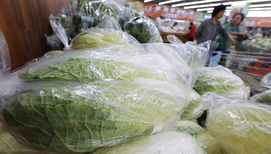 19일 서울 서초구 하나로마트 양재점을 찾은 시민들이 배추를 살피는 모습. (사진=연합뉴스) 반복되는 폭염과 폭우 여파로 농산물 가격이 가파르게 상승하고 있다. 특히 배추 한 포기당 평균 소매 가격이 7000원을 돌파했다.