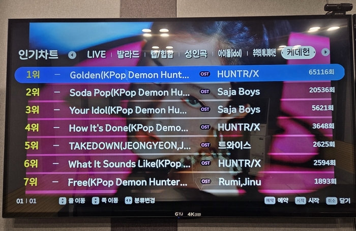 TJ미디어 노래방 내 케이팝데몬헌터스 수록곡이 화면에 표시된 모습. <TJ미디어> ‘케이팝데몬헌터스’의 인기가 노래방으로도 옮겨붙었다.
