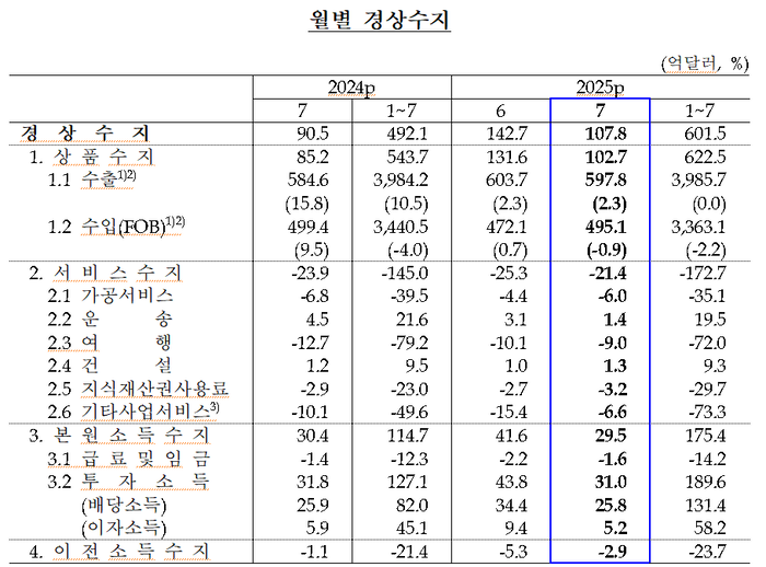 [속보] 7월 한국 경상수지 107.8억달러…27개월 연속 흑자