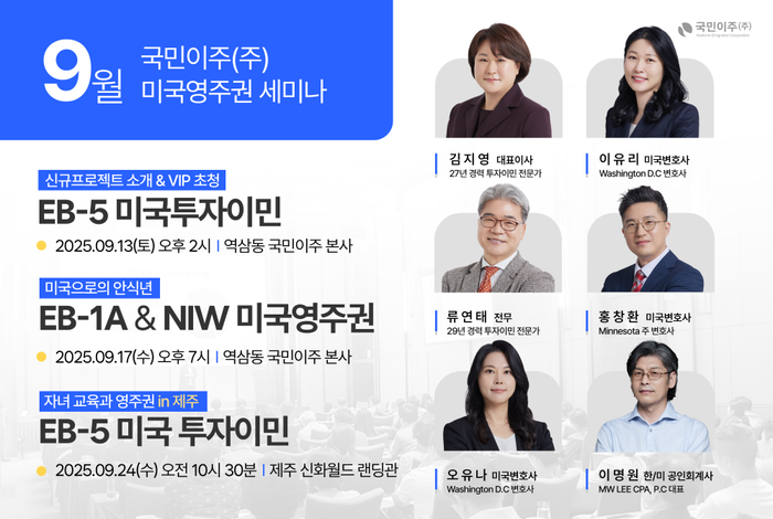 이 같은 수요 변화에 맞춰 미국투자이민(EB-5) 전문 기업 국민이주㈜가 9월 한 달간 미 영주권 종합 세미나를 연속 개최한다. EB-5는 물론 고학력·특기자 이민(NIW·EB-1A)까지 한 자리에서 비교·설계하는 자리로,투자 구조와 법무,실제 사례를 균형 있게 다루는 것이 특징이다.