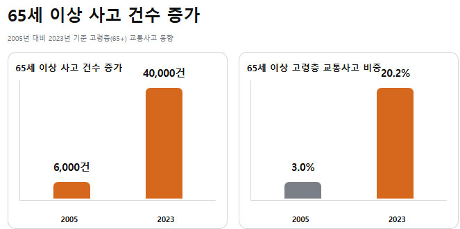 [매경AX] 연구원은 65세 이상 사고 건수는 지난 2005년 6000건에서 2023년 4만건으로 대폭 늘어났다고 설명했다. 반면 65세 미만 교통사고는 같은 기간 20만 1000건에서 15만 6000건으로 감소했다.